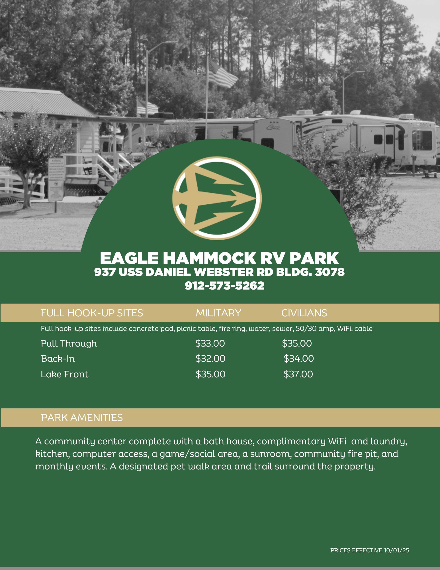 Southern hospitality and an unspoiled environment welcome you at the wooded, 220-acre RV park located along Lake D in the heart of Naval Submarine Base Kings Bay. Come see why Eagle Hammock RV Park earned the Campers Choice Award for the Best Military Campground in the Eastern United States. The beautiful lakefront setting is filled with picture-perfect scenery and abundant wildlife.
